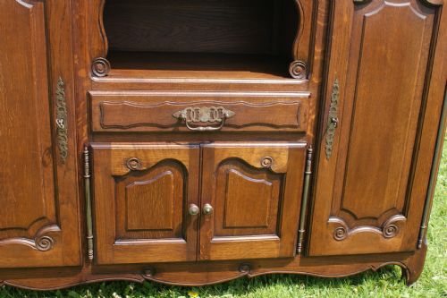 This is flanked by a cupboard to each side which has 2 shelves to the inside, fully adjustable up and down and is enclosed with a pair of carved panel doors complete with working locks.