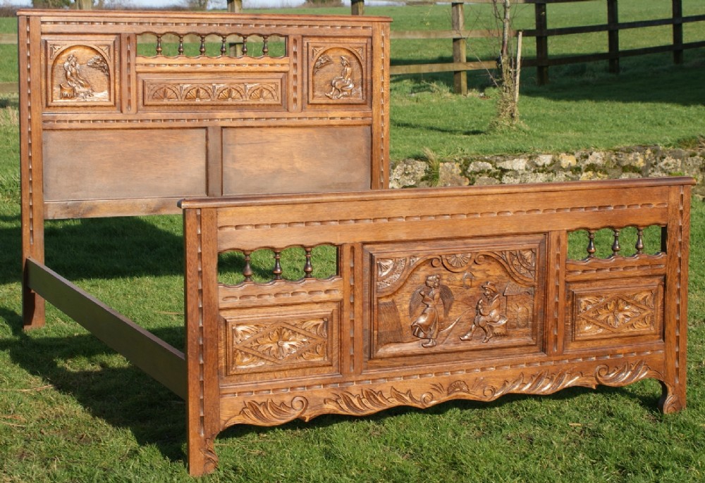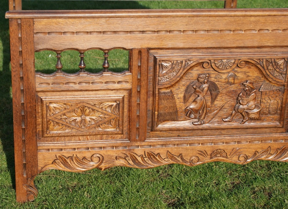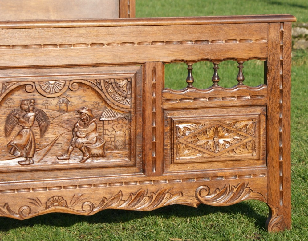 With it's Celtic overtones, the head and foot board have finely carved panels depicting traditionally dressed Bretton men and women. This is further complimented with a series of galleried spindles which is typical of the Breton region.