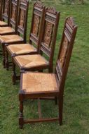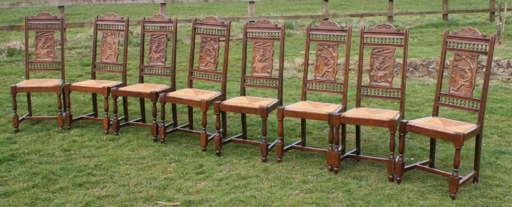 The backs of the chairs are well crafted with a super carved central splat depicting traditional Breton men and women and is further complimented with 2 galleries of turned spindles and an attractive cresting rail..