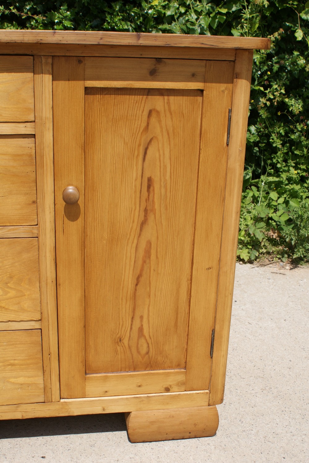 Dating to the early mid part of the 20th century this East German pine Cupboard is in very good condition. Standing on stylized deco feet, the cupboard has 4 drawers to the left hand side which are all constructed with hand cut dovetail joints and all have later wooden knobs. To the right there are 2 shelves to the inside which are enclosed with a single panel door..