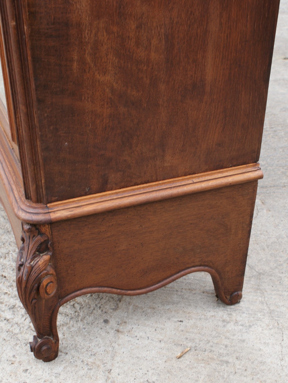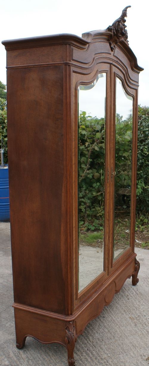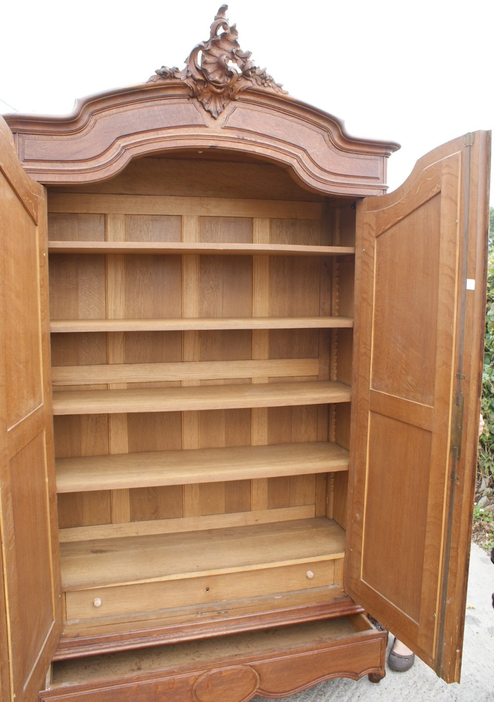 Standing on traditional escargot feet with carved acanthus leaf knees, the armoire has a full width apron drawer which is constructed with hand cut dovetail joints, runs with ease and has a moulded edge.