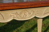 The main frame of the table has been painted with Annie Sloan chalk paint (colour, Paris Grey and off white) Then distressed and aged with Fiddies antique brown wax..