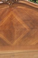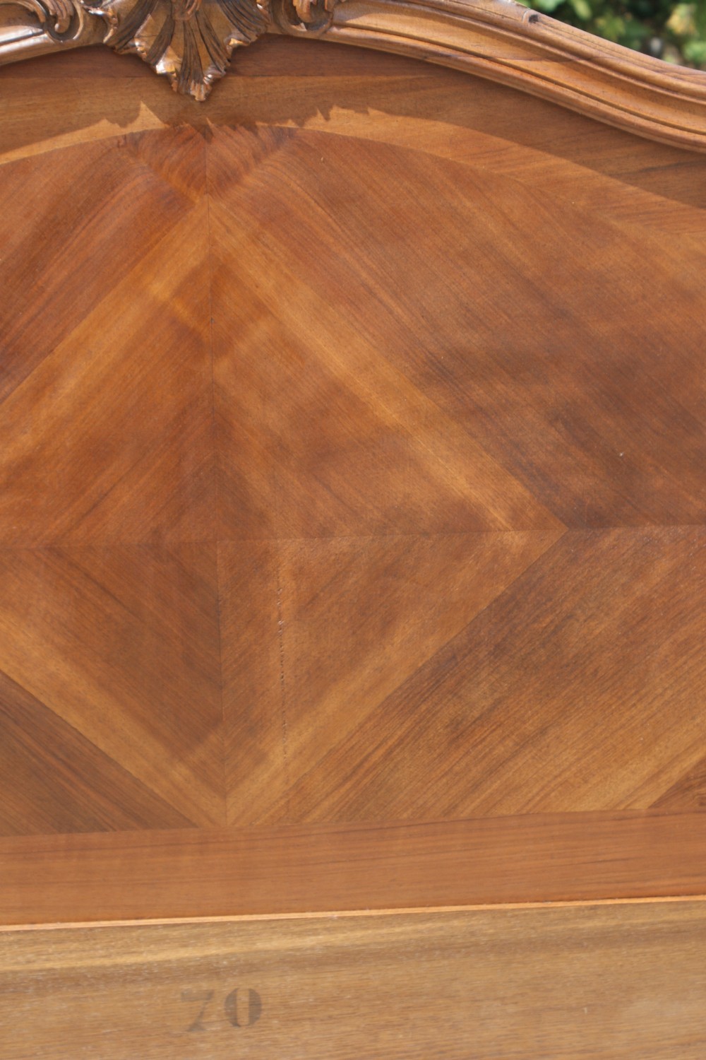 Standing on traditional escargot feet with carved acanthus leaf knees, the head and foot board have quarter cut walnut veneer panels with a moulded serpentine frame and a finely carved Rococo shell pediment..