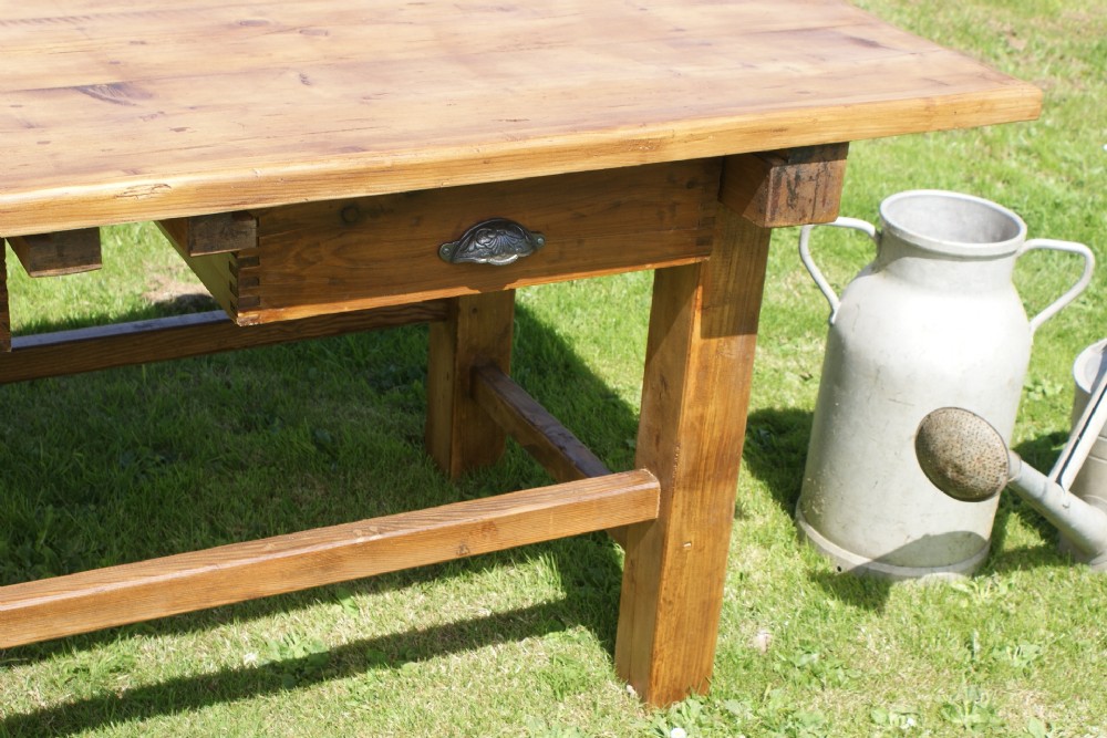 The table is well constructed with mortise and tenon joints all round and benefits from having 2 large drawers which are constructed with finger joints and have later cast iron handles. These drawers can be accessed from either side of the table and run the entire width..