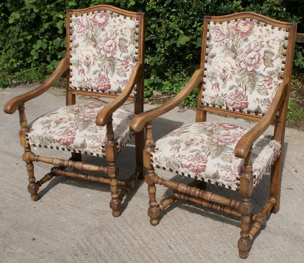 Dating to the early 20th century, this super pair of French beech arm chairs are in very good condition.. The chairs stand on traditional turned legs with complimentary cross stretchers and turned arm supports. The beautiful floral studded fabric is in very good condition with no marks or wear. The chairs are in their original polish and have been given 2 coats of English oak wax giving a fine patination.. the chairs each measures; seat is 24 inches wide x 22 deep with a height of 18.5 inches. the over all height to top of back is 43 inches The cost to deliver these chairs to England, Wales and Scotland (Glasgow to Edinburgh) is £65.00. (please see website for further shipping details below) Alternatively you are welcome to collect from my showroom at any time. If you would like any further information or would like to view this item, please feel free to give me a call. We have a large showroom filled with an interesting stock of furniture from all regions of France. As we live on the premises, viewing can be made at any time, but please give me a quick call to make sure I'm here. Nick. Internal Ref: M496