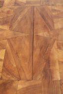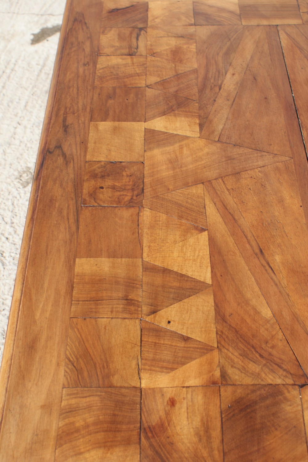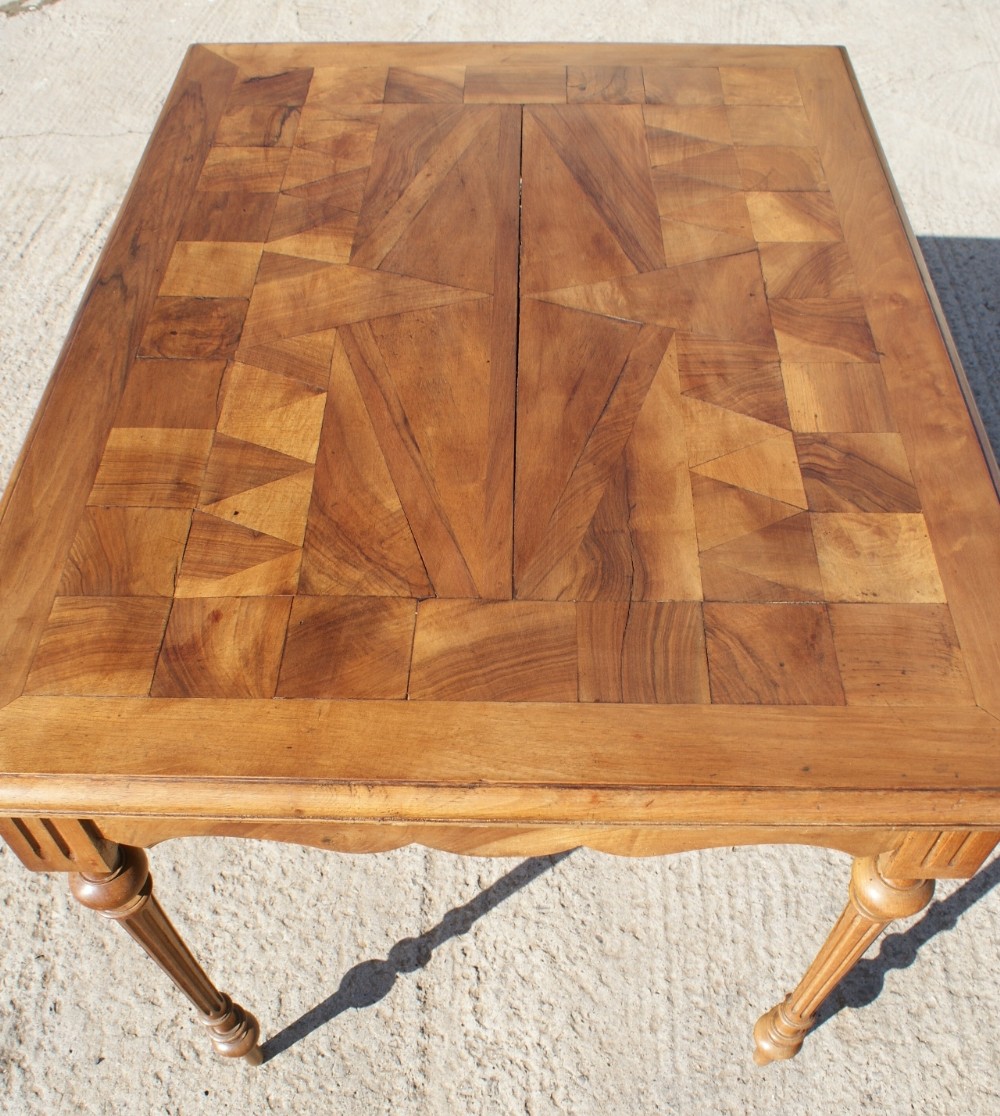 The parquet top is constructed with solid pieces of walnut on an oak ground. As shown in the photo and commensurate with it's age, there is a little unevenness and shrinkage to the topbut more than would be usual.