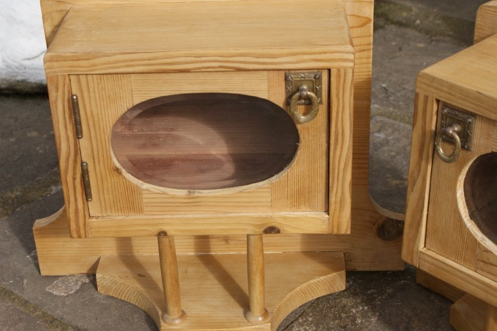 This pretty little pair of Dutch pine wall cabinets are in very good condition. The cabinets are well constructed with hand cut dovetail joints. The open shelf to the bottom has 2 turned columns which rise up to support the little cabinet. This is enclosed with a glazed door complete with it's original catch and handle. The cabinets have been stripped and polished with 3 coats of wax giving a warm patination.?each cabinet measures 15inches wide max 5.25 inches deep max 12.5 inches high.