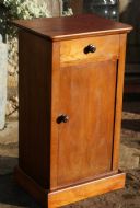 This late 19th century French cherrry bedside cabinet is in good condition and stands on a plinth. The cupboard has a single shelf to the inside which is enclosed with a solid panel door complete with original cupboard turn wooden knob. Above this there is the frieze drawer which is well constructed with it's original knob. The top is all good with no significant marks, though there is a couple of candle scorch marks as shown in the photo.
